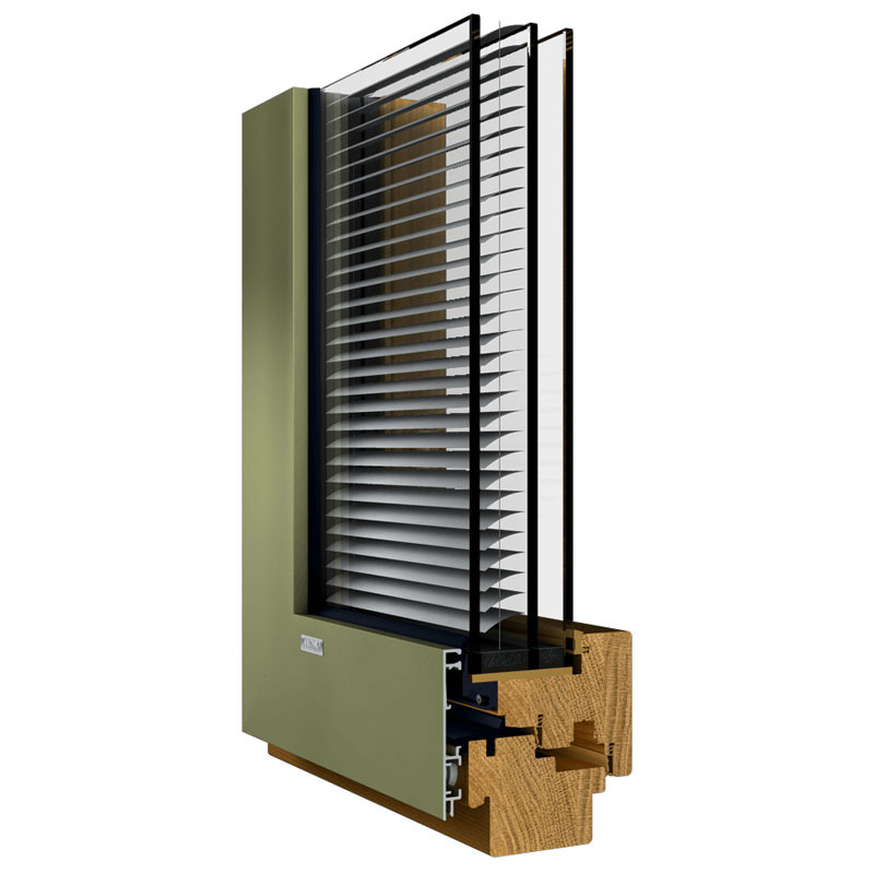 Eine Konstruktion ohne sichtbare Flügelschale. Extravagantes Design entsteht bei Überdämmung des Blendrahmens. I-Tüpfelchen ist die stufenlos verstellbare Jalousie im Scheibenzwischenraum.