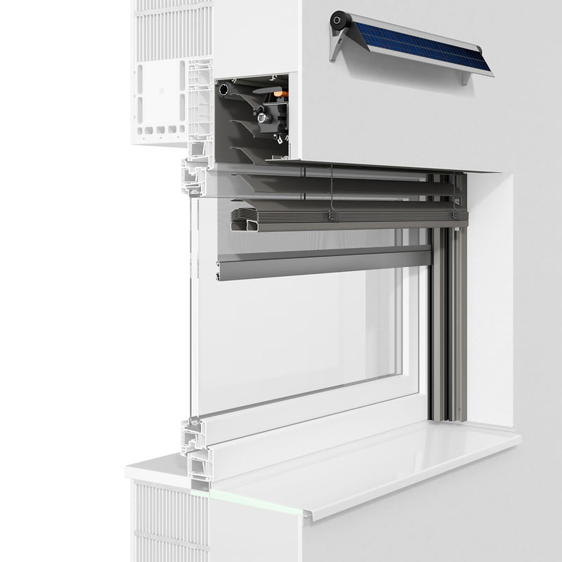 Multifunktionalität und Komfort Durch die auf Plattformtechnologie basierenden Rollladensystemen der .XP-Baureihe, erhält der Bauherr moderne Bauelemente, die durch Zusatzausstattungen multifunktional ausrüstbar sind und dadurch einen deutlichen Mehrwert bieten. Die auch nachträglich einsetzbaren Module mit Insektenschutzgitter oder textilem Sonnenschutz erweitern den Rollladen sinnvoll. Es sind keine von außen montierten Extra-Einrichtungen nötig. Alles ist sauber im Kasten untergebracht und wird in einer zweiten Laufkammer hinter dem Rollladenprofil geführt. |