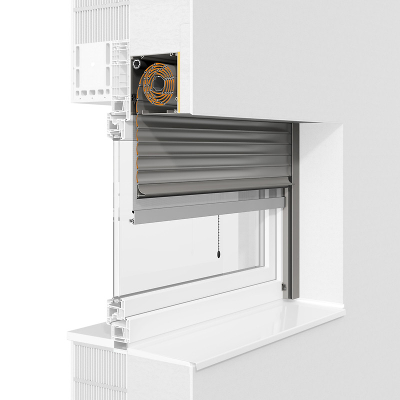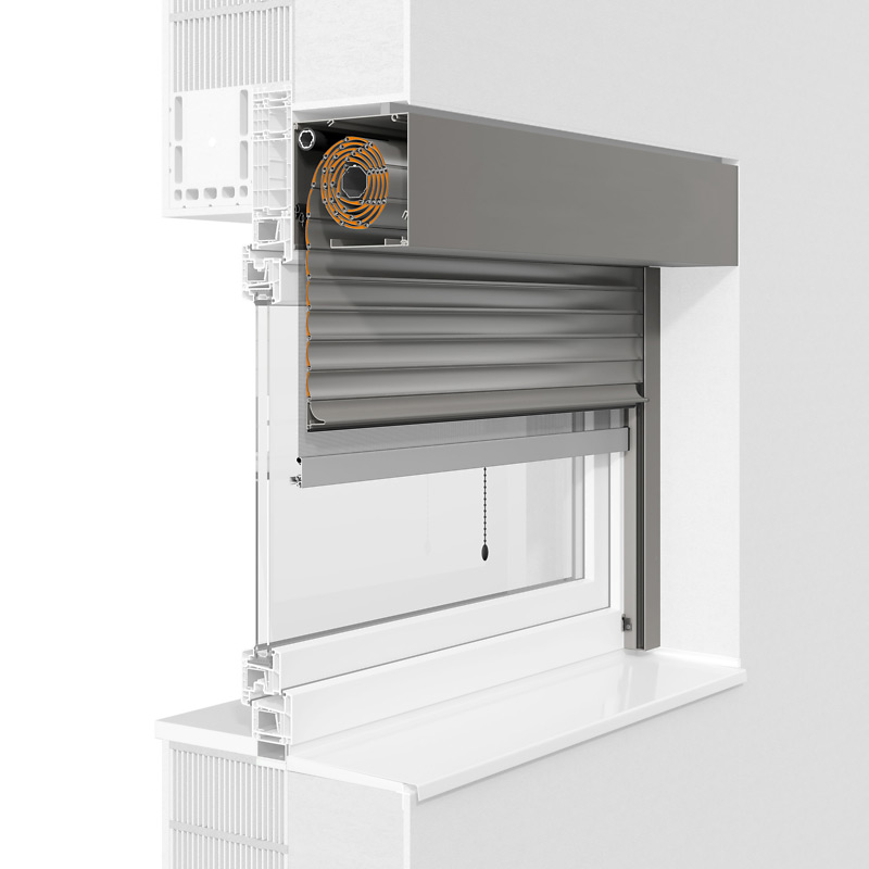 Kennzeichen ist die fünfeckige Kastenform und individuelle Zusatzausstattungen wie etwa Insektenschutzgitter ergänzen dieses Rollladensystem.